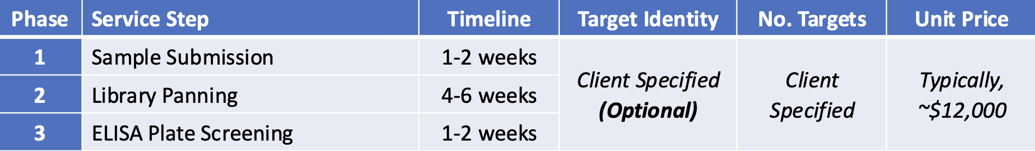 Panning Process: Our sdAb library has been applied to the discovery of targets spanning small molecules, proteins, and whole cells. While we have many display methods at our disposal, most panning is performed in a conventional M13 phage display format. By bypassing animal immunization, we’re able to complete panning in 4-6 weeks without the need for a months-long immunization and library creation process.