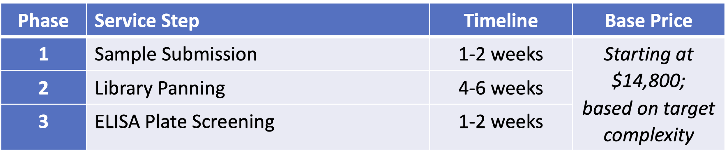 Panning Process: Our sdAb library has been applied to the discovery of targets spanning small molecules, proteins, and whole cells. While we have many display methods at our disposal, most panning is performed in a conventional M13 phage display format. By bypassing animal immunization, we’re able to complete panning in 6-8 weeks without the need for a months-long immunization and library creation process.